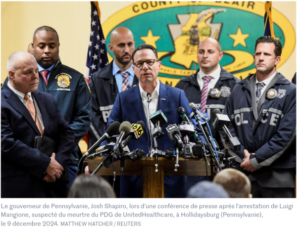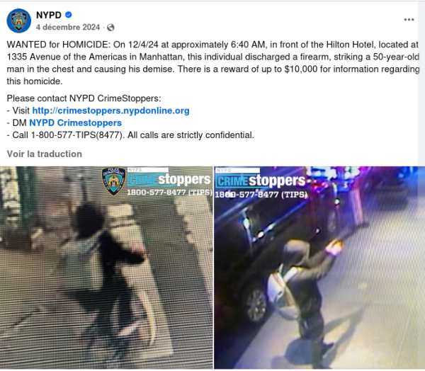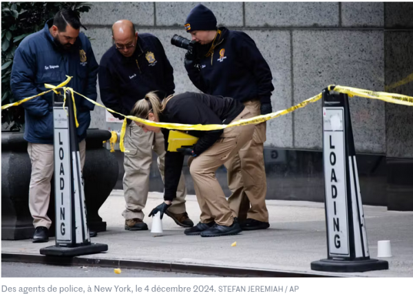 je me le demande – en tout cas dans les mêmes lieux se prépare à manger la même nourriture – c’est un peu loin du sujet, mais l’état de santé des autochtones nous en rapproche. Le tireur donc fut interpellé ici ou là :son forfait, cinq jours plus tôt : avoir assassiné (il nie tout en bloc) le CEO (chief executive officer – en français plutôt dg – directeur général) de la première entreprise d’assurances-maladie du pays. Ici, les images illustrant le lieu du crime ce matin du 4 décembre 2024