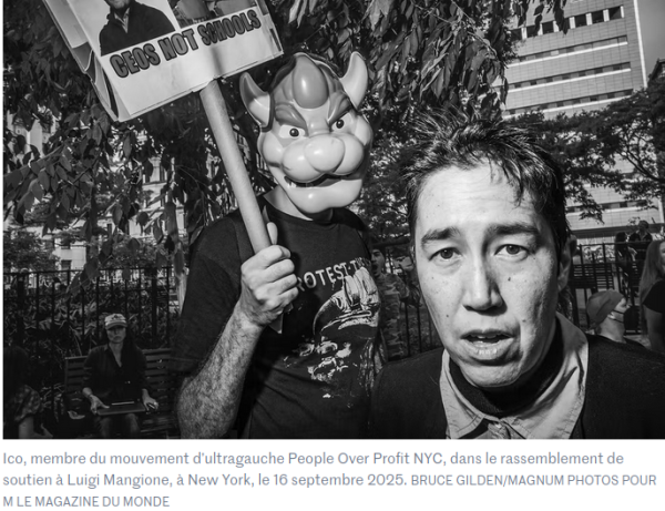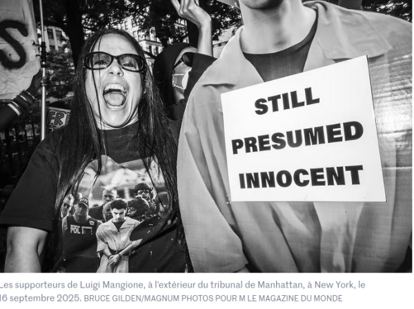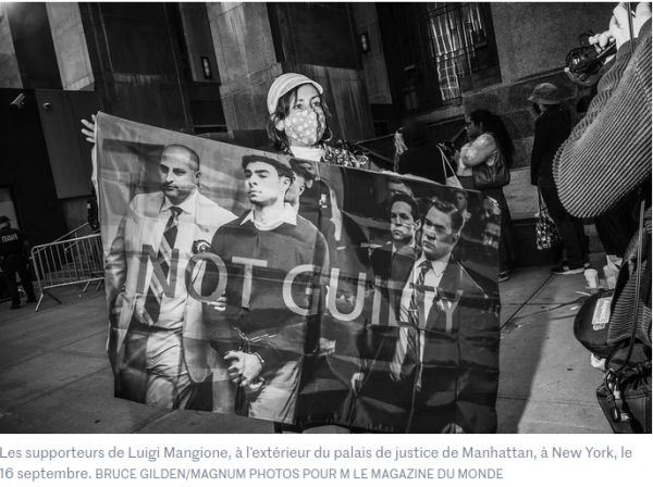 le même mode opératoire donc – sauf que Luigi a tué le CEO (un homme d’une cinquantaine d’années, blanc certes, qui devait gagner quelques centaines de milliers de dollars par an, sur le dos des assurés corporate) – en septembre dernier, Luigi passait devant une cour de justice et à cette occasion, une foule de gens (en noir et blanc) lui apportèrent leur soutien