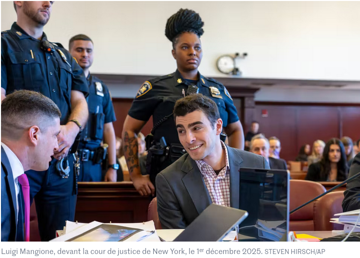 le même mode opératoire donc – sauf que Luigi a tué le CEO (un homme d’une cinquantaine d’années, blanc certes, qui devait gagner quelques centaines de milliers de dollars par an, sur le dos des assurés corporate) – en septembre dernier, Luigi passait devant une cour de justice et à cette occasion, une foule de gens (en noir et blanc) lui apportèrent leur soutien