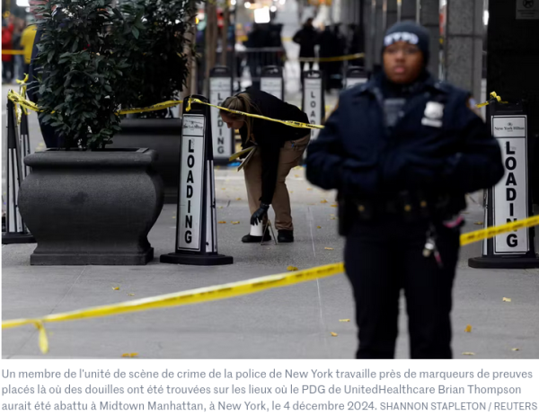 je me le demande – en tout cas dans les mêmes lieux se prépare à manger la même nourriture – c’est un peu loin du sujet, mais l’état de santé des autochtones nous en rapproche. Le tireur donc fut interpellé ici ou là :son forfait, cinq jours plus tôt : avoir assassiné (il nie tout en bloc) le CEO (chief executive officer – en français plutôt dg – directeur général) de la première entreprise d’assurances-maladie du pays. Ici, les images illustrant le lieu du crime ce matin du 4 décembre 2024