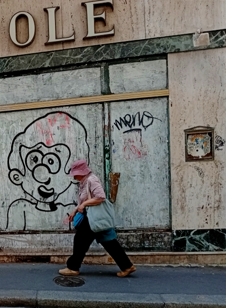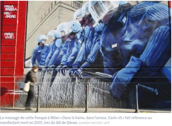 une fresque murale en souvenir de Carlo Giuliani mort tué par la police du G7 (organisé par Berlusconi il n’y a pas de hasard, il n’y a pas de mystère : la crevure est crevée) en juillet 2001- « dans la haine et dans l’amour Carlo reste vivant  » vingt-et-un ans – quel est ce monde ? le nôtre – et elle