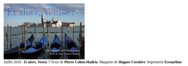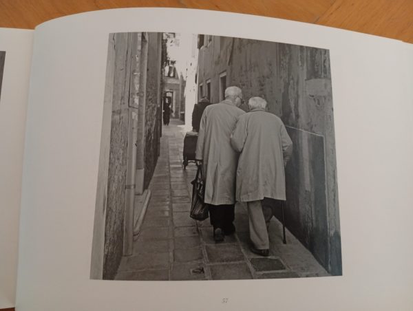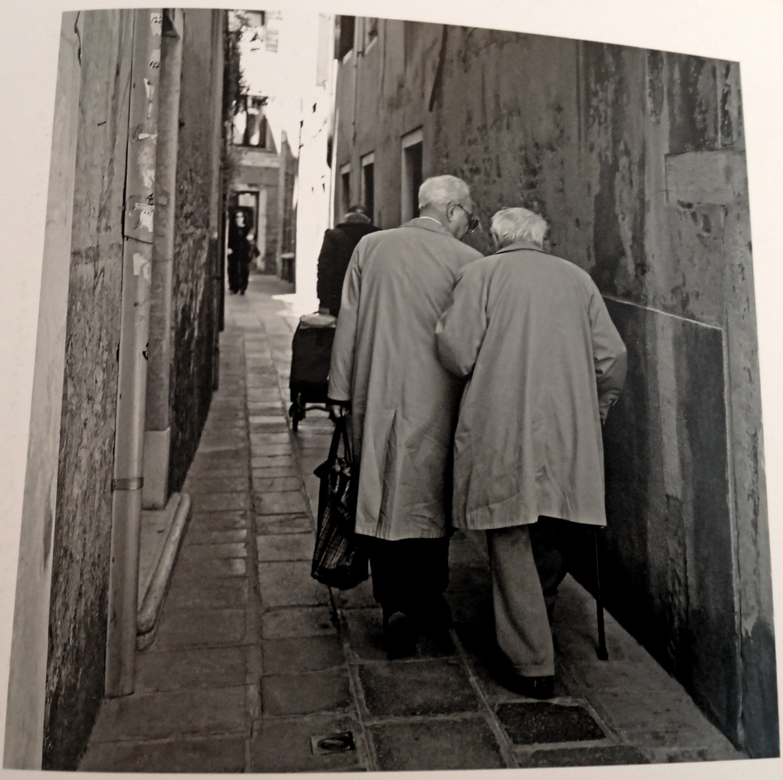qui date de plusieurs années (le voyage de l’ami Denis Pasquier † à Venise – dix ans sans doute – qui précédait celui de Lisbonne) ce genre de prise de bras, la canne le sac à provisions (le sosie de Claude Lévi-Strauss), les impers la calle et les gens au fond qui viennent vers nous (il n’y en a qu’un mais gens n’a pas de singulier), celui qui traîne son caddie – qui sont-ils ? des frères, des amis, des amants ? qui peut savoir ?